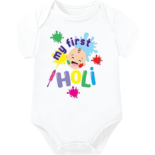 Lillypupp My first Holi baby dress for boy girl. Unisex monthly milestone Holi t-shirt romper onesie bodysuit for new born photoshoot.