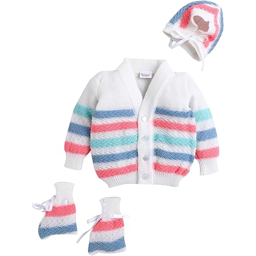 Little Angels Baby Sweater Set – 3 Pcs Woollen Full Sleeves V-Neck Textured Striped Sweater, Cap & Socks for 0 to 12 Months
