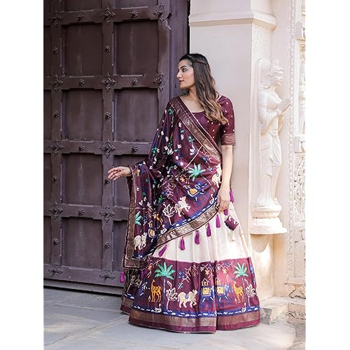 7 reviews for MAIRA FASHION Women’s Tussar Silk With Leheriya And Foil Print Lehenga choli Set (WINE)