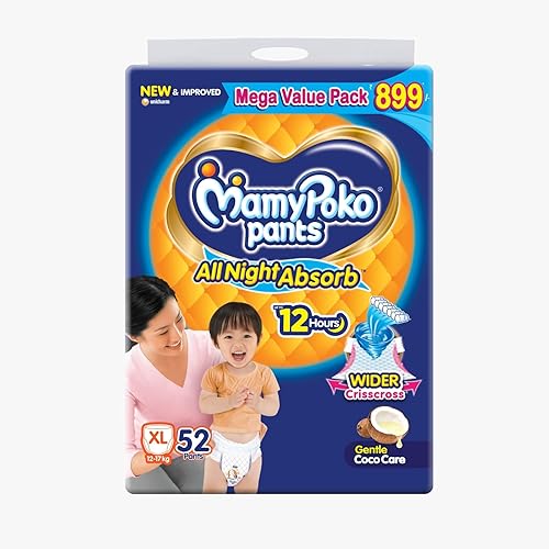 3755193 reviews for Mamypoko pants All Night Absorb| Pant Style Baby Diapers X- Large Size(XL), 52 Count, Ideal for 12-17Kgs|+50% wider and repeated absorption for all night 12hr protection from leakage, prevents heaviness.