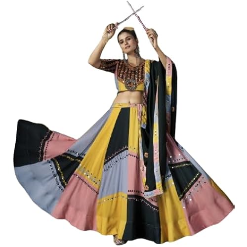 - The multi-color navratri lehenga is adorned with intricate printed work and sparkling mirror embellishments, capturing the vibrant essence of the festival.