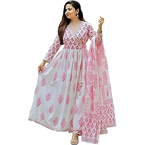 5741 reviews for MEERA FAB Women’s Cotton Printed White Anarkali Kurta with Palazzo & Dupatta Set