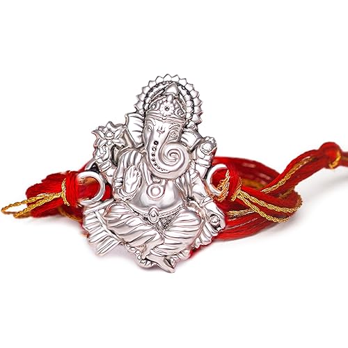 4754 reviews for Milan Jewellers Certified 99.5% Pure Silver Om Ganesh Rakhi with Pure Cotten Red and Golden Zari Thread, Roli Chawal bottles