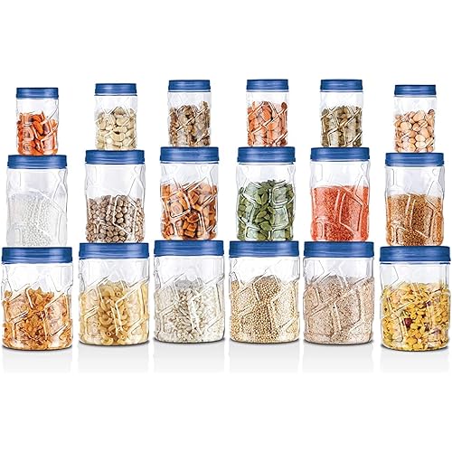 - Colour: Blue; Material: Plastic; Package Content: 18 – Pieces Vitro Jar Set (6 pcs x 230 ml Each, 6 pcs x 600 ml Each, 6 pcs x 1.18 litre Each)