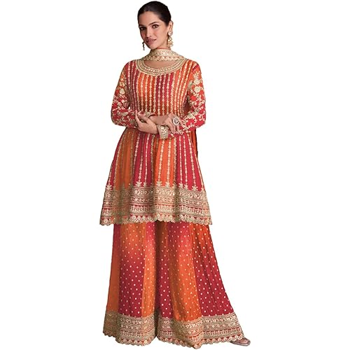 365246 reviews for Miss Ethnik Dual Tone Strip Chinon Heavy Embroidered Stitched Sharara Suit Set With Dupatta (ME-1129)