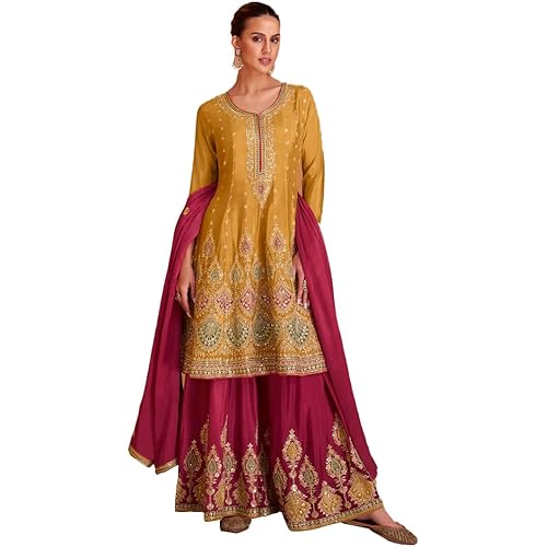 34 reviews for Miss Ethnik Women’s Golden Yellow and Pink Color Readymade Chinon Embroidered Kurta Palazzo Set With Embroidered Dupatta (ME-1136-Yellow)