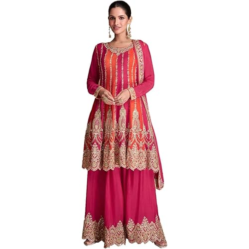 183 reviews for Miss Ethnik Women’s Pink and Orange Color Traditional Chinon Embroidered Stitched Kurta Palazzo Set With Embroidered Dupatta (ME-1132-Pink)