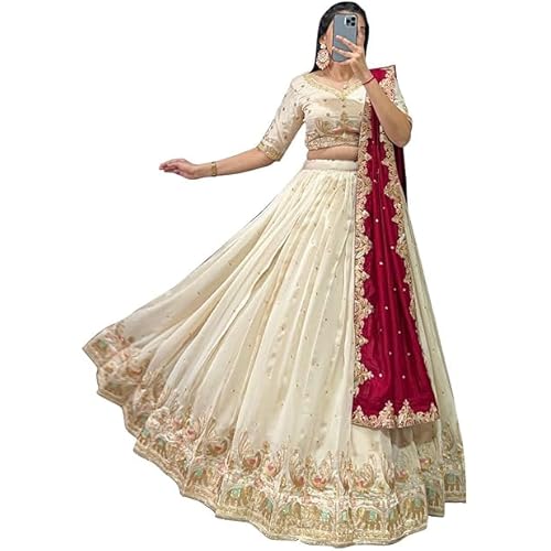 - FABRIC COMPOSITION: Premium quality fabric ensemble with an off-white lehenga and blouse, paired with a striking maroon dupatta