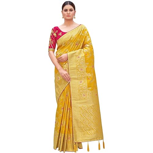 Monjolika Fashion Women’s Banarasi Silk Blend Zari Woven Work With Tussles Saree and Embroidered Work Blouse Piece(37769 color)