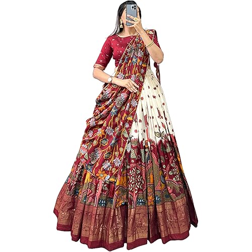 MR CREATION Women’s Wedding Special Tussar Silk With Kalamkari Print Lehenga Choli ready to wear Chaniya choli for women flared lehenga