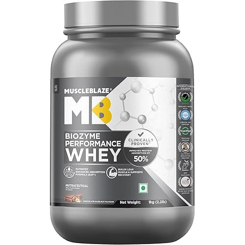 14278 reviews for MuscleBlaze Biozyme Performance Whey Protein Powder, Chocolate Hazelnut (1kg / 2.2lbs) | 25g Protein Per Scoop | Clinically Tested 50% Higher Protein Absorption