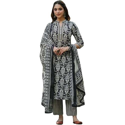 NAINVISH Women’s Rayon Printed Straight V-Neck Kurta Pant with Dupatta