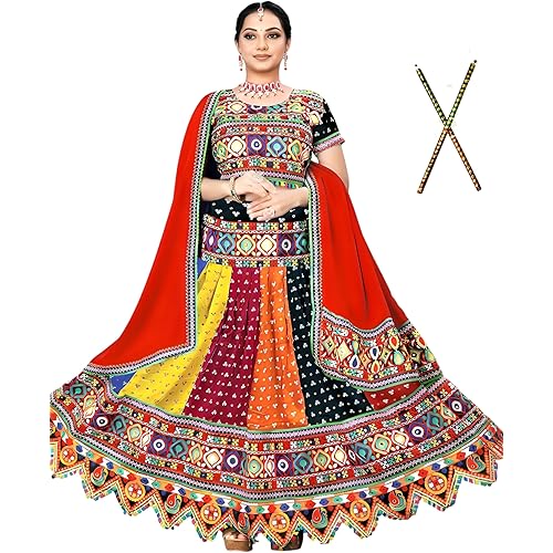 NATKHAT DRESS – Ghaghra Choli With Dandiya Stick for Garba, Ethnic Gujarati Style Cotton Rayon Long Skirt Lehenga With Free Dandiya