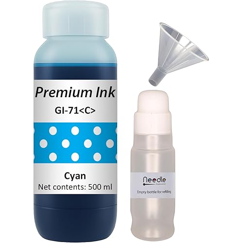 Needle GI71 Compatible Refill Ink | Made in India |for Canon Pixma G1020 G2020 G3020 G2060 G3060 G1737 G2770 G3770 G4770 G1730 G2730 G3730 Printers (Cyan – 500gms with Empty Bottle & Funnel)