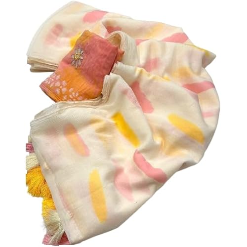 NIRAVE FASHION Pure Linen Cotton Paint Saree with Cotton Handwork Blouse, Lemonish White, 5.5 Meters