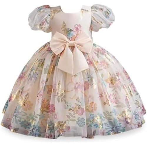 Niren Enterprise Baby Girls Fit And Flare Knee Length Gold Foil Butterfly Puff Sleeve Bowknot Princess Gown Dress for Special Occasions