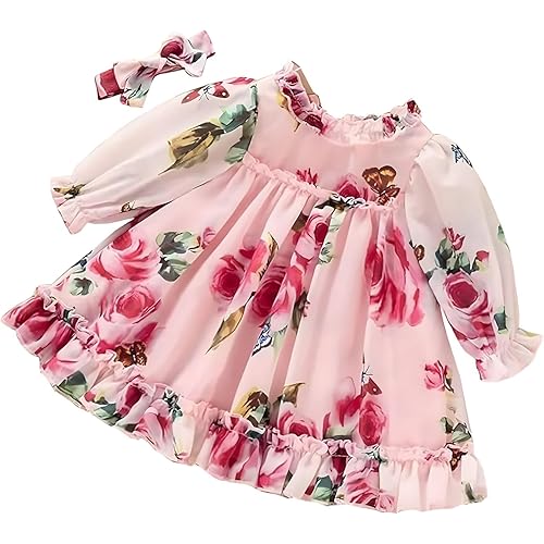 Niren Enterprise Pink Summer Floral Printed Full Sleeve Ruffle Pattern Baby Girl Frock
