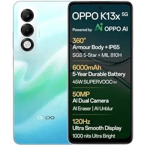 42575 reviews for OPPO K13x 5G 6000mAh and 45W SUPERVOOC Charger & AI (Breeze Blue, 128 GB) (6 GB RAM)