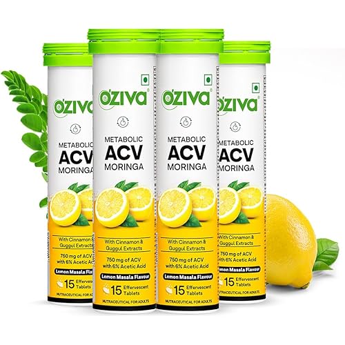 OZiva ACV Moringa | Control Cravings I Apple Cider Vinegar, Cinnamon, Guggul I No Maltodextrin & No Added Sugar I 15 Effervescent Tablets – Lemon Masala, Pack of 4 (60 tablets).