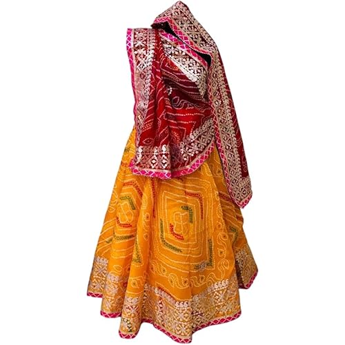 Pakhee Creation Bandhej Kota Doria fully stitched Lehenga Choli Dupatta Set with Gota full work and lace (1)