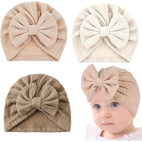 PALAY® 3pcs Cap for Baby Girl Boy, Lovely Bow Caps for Babies, Soft Warm Turban Baby Cap 0-3 Month, Stretchy Baby Girl 3-12 Months Infant Hat for Newborns Shower Gift
