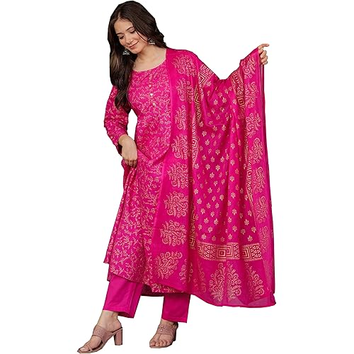 PARTHVI Women’s Printed Cotton Anarkali Kurta & Pant With Dupatta Set