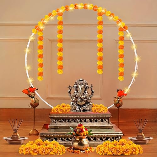 Party Propz Circular Pooja Backdrop Stand for Decoration – 5Pcs Ganpati Decoration Setup for Home, Ganpati Backdrop Decorations Set with Artificial Marigold Flowers and Fairy Light, GanDecorations