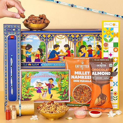 77 reviews for Phool Rakhi Gift for Brother – 7 Inclusions + Evil Eye Rakhi, Choco Almonds Sweets & Namkeen Snacks for Brother, Incense Sticks, Rakhi Card with Message – Complimentary Roli and Chawal | Raksha Bandhan Gift for Brother and Bhabhi | Rakhi hamper for brother and sister