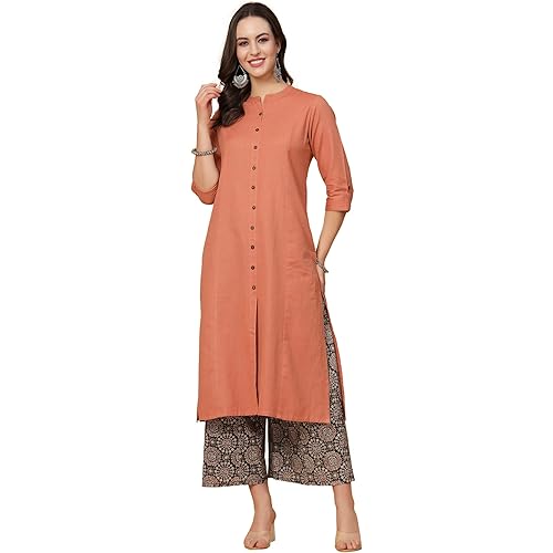 - FEATURES & EXCELLENT FITTING :- KURTI :: Sleeves :-: 3/4th Fold-up Sleeve, Pattern : solid and printed, Chinese Collar with V Neck, Buttoned are fixed Not Openable, PALAZZO :: Matching Printed Palazzo , Length : 38-39 Inches , Long Flair , Closer Type :: Drawstring