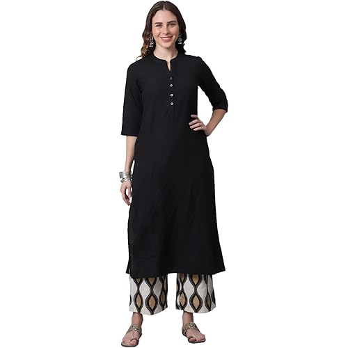 - FEATURES & EXCELLENT FITTING :- KURTI :: Sleeves :-: 3/4th Fold-up Sleeve, Pattern : solid, Chinese Collar with V Neck, Buttoned are fixed Not Openable, PALAZZO :- Style :: Matching Printed Palazzo , Length : 38-39 Inches , Long Flair , Closer Type :: Drawstring