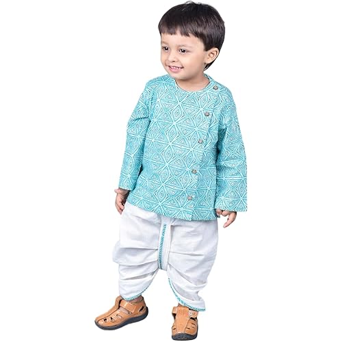 POLKA TOTS Boy’s Cotton Full Sleeve Angrakha Kurta with Dhoti Set for Baby Kid, Traditional Ethnic Wear for Kids, Printed Dhoti Kurta Set with Round Neck for Boy’s