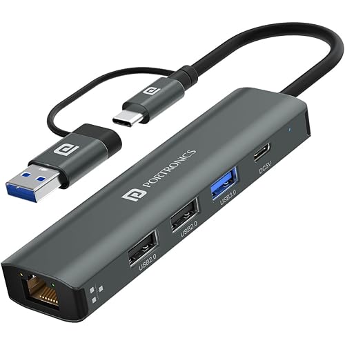 Portronics Mport Edge,5 Ports Dual USB Hub, Superfast USB 3.0, High Speed 2.0, Type-C Data Transfer, 100 Mbps RJ45 Ethernet, Versatile & High-Speed Connectivity Hub for Laptops & Desktops (Grey)