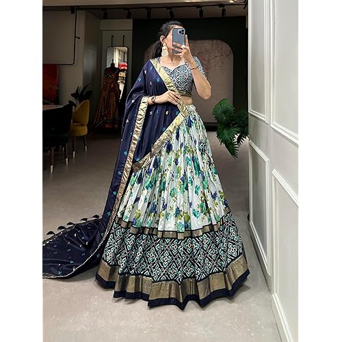 PRAGATI CREATION Women,s Tussar Silk With Leheriya And Foil Print Lehenga choli Set (BLUE)