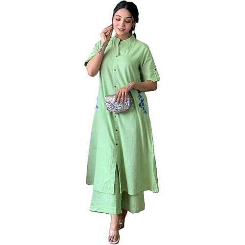 Preeson Women’s Pure Cotton Chick Embroidery Solid Co-Ord Set | Ethnic Half Sleeves Cotton Kurta Pants Set