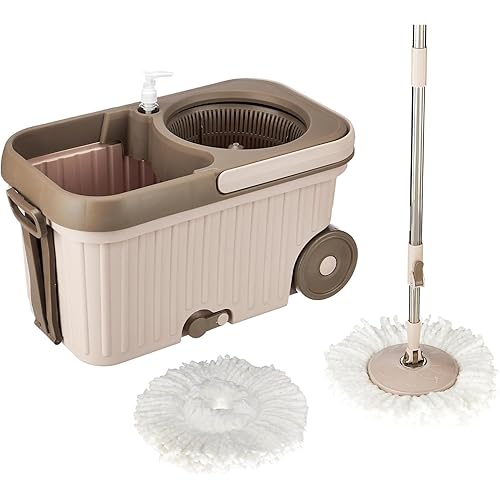 - Twin-bucket system, soap dispenser and side bucket handle help dip and dry the mop separately with an outlet. Big bucket with drain plug helps draining the dirty water easily.