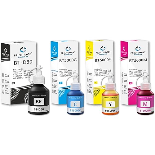 Print Page BT-D60BK & BT5000 (C/Y/M) Refill Ink Compatible for Printers T220, T420, T520, T820, T920, T510, T910, T710, T4000W, T4500W, T300W, T800W (4 Color Combo) (Black – 105ml, C/Y/M – 50ml Each)
