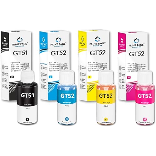 Print Page GT51/GT52 Premium Refill Ink Compatible for Ink Tank 115, 310, 315, 319, 410, 415, 416, 419, 455, 500, 515, 530, 615,GT 5810/5811/5820 (4 Color Combo) (Black – 90ml, C/Y/M – 70ml Each)