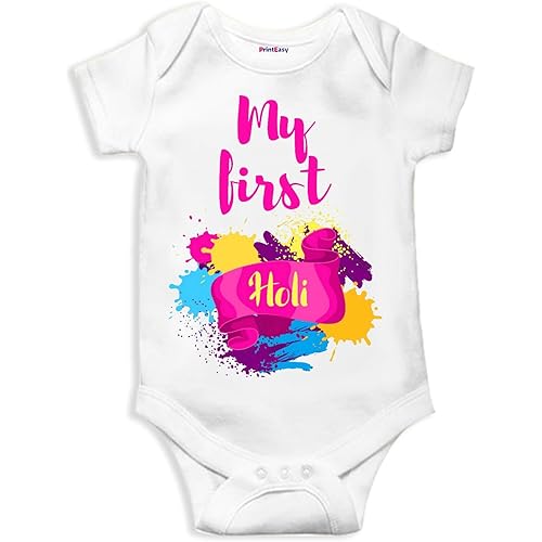 PrintEasy Cotton My First Holi With Mumma and Papa Dress White Half Sleeve Romper | Onesie For Baby -01