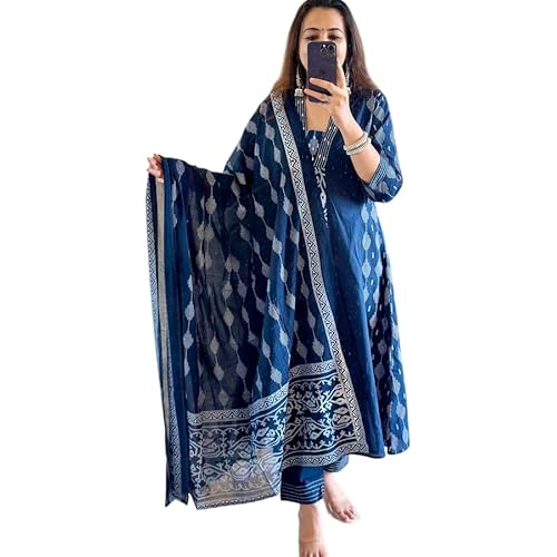 Rangnavi Women’s Cotton Anarkali Printed Kurta with Palazzo & Dupatta Set