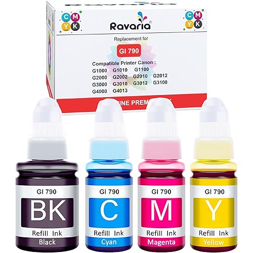 Ravaria Compatible Ink for Canon Gi 790 Pixma Ink Suitable for Canong1000 / G1010 / G1100 / G2000 / G2002 / G2010 / G2012 / G2100 / G3000 / G3010 / G3012 / G3100 / G4000 / G4013 (CMYK Set)