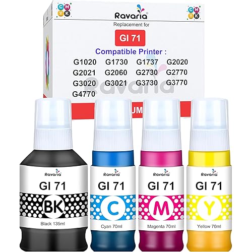 Ravaria GI 71 Ink for Cn Printer G1020 G1730 G1737 G2020 G2021 G2060 G3020 G3730 G3770 G4770 (GI 71 Ink CMYK 1 Set)