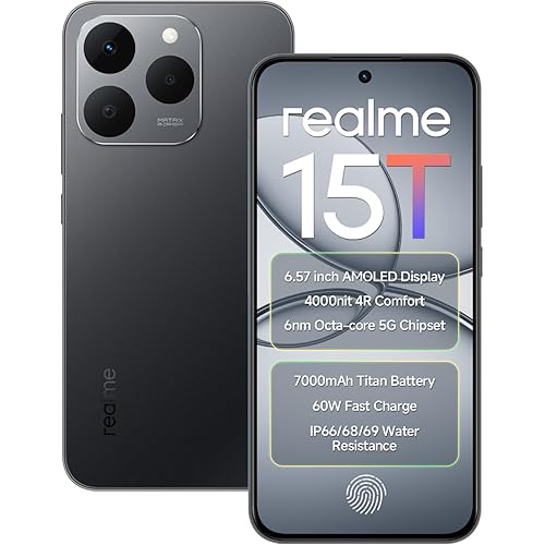 435136 reviews for realme 15T 5G Smartphone 256GB ROM 8GB RAM 7000mAh Battery 6.57 inch 120Hz AMOLED Display 60W Fast Charge, IP69 Water Resistance Support Fingerprint GPS Bluetooth Dual Stereo Speakers (Suit Titanium)