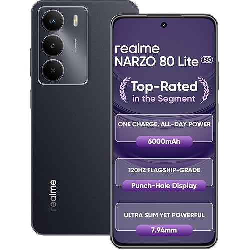 4253342 reviews for realme NARZO 80 Lite 5G (Onyx Black, 6GB+128GB) | 6000mAh Long-Lasting Battery | MediaTek Dimensity 6300 5G | AI Assist | IP64 Rated Water & Dust Resistance | Military-Grade Durability