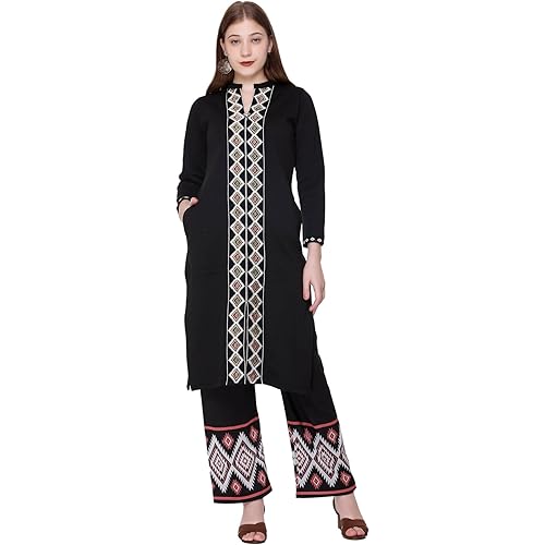 - Features:- Woolen Fabric Mandarin V Neck, Jacquard Knitting, Full Sleeves, Side Pockets on Kurti, Comes up with Bottom Wear (Palazzo)