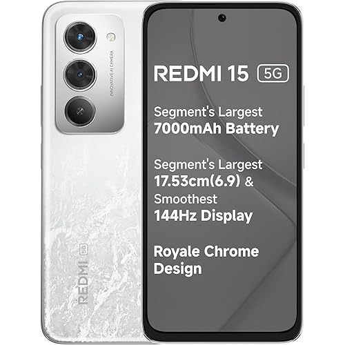 405904 reviews for Redmi 15 5G Frosted White 8GB + 256GB | Segment’s Largest 7000mAhA Battery | Segment’s Largest Display 17.53cm(6.9) Up to 144Hz | Snapdragon 6s Gen 3 | 18W Reverse Charging | 50MP AI Dual Camera