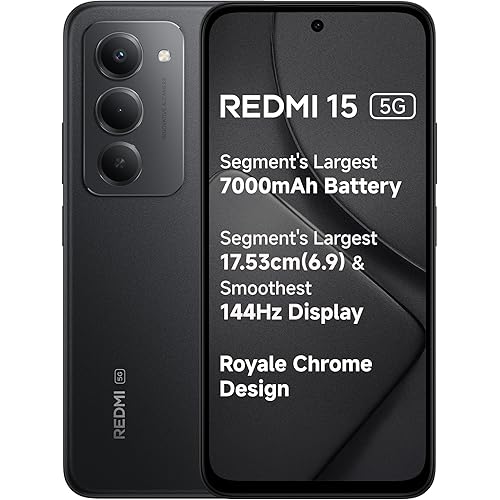 405951 reviews for Redmi 15 5G Midnight Black 8GB + 256GB | Segment’s Largest 7000mAhA Battery | Segment’s Largest Display 17.53cm(6.9) Up to 144Hz | Snapdragon 6s Gen 3 | 18W Reverse Charging | 50MP AI Dual Camera