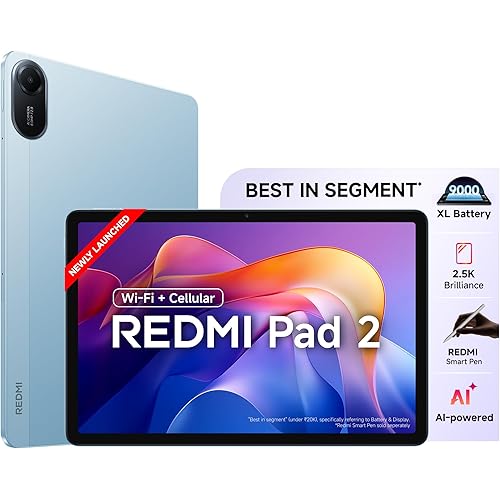 Redmi Pad 2 Wi-Fi + Cellular, Active Pen Support, 27.94cm(11″) Model, 2.5K Sharp & Clear Display, 4GB, 128GB, All Day & More 9000mAh Battery, AI-Enabled, Dolby Atmos, HyperOS 2, Sky Blue
