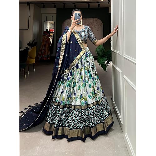 RENTOOR The timeless bandhani print chaniya choli showcases intricate ajrakh print and foil lacework, combining elegance and tradition in a stunning ensemble Lehenga choli set (NAVY BLUE)