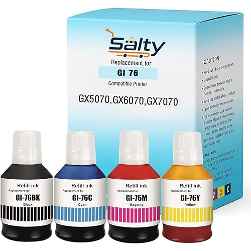 salty GI-76 Ink Suitable Bulk Bottle Water Based Refill Ink for Canon MAXIFY GX5070,GX6070,GX7070 Printer (Set 1) Black, Cyan, Magenta Yellow