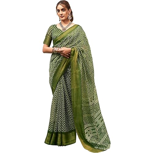 SAMAH Women’s Cotton Blend Geometric Printed Zari Stripe Saree with Unstitched Blouse Piece